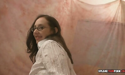 Pale brunette Jessica Marie with glasses groans while riding a rock-hard dick