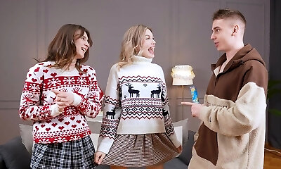 Skinny Russian dude is getting double blowjob from two hot teen dolls