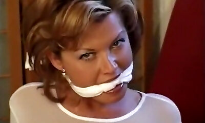 Big-mouthed barmaid robbed, left hogtied, exposed, and gagged in her stocking