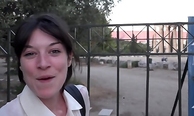 Lucky guy talked a brunette cutie into playing with his fuckpole