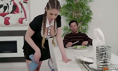 Stacked maid is going to work on his hard cock in a taboo video